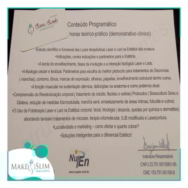 Formação no curso Internacional de Actualización em Electroestetica pelo empresa CEC Eletrônico com a Licenciada Kinesigloga Dra. Ignazi Diana e o Licenciado Kinesiólego Gudião Meniela/ Posadas Misiones, Argentina, entre outros.