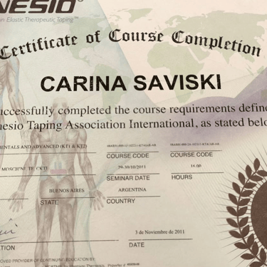 Formação no curso KINESIO TAPING ASSOCIATION INTERNATIONAL - KTI/XT2 pela empresa Kenzo Kinesio com a professora Dra, Adriana Meschini/ Buenos Aires, Argentina;